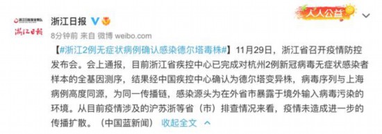 11月29日,浙江省召开疫情防控发布会。会上通报,目前浙江省疾控中心已完成对杭州2例新冠病毒无症状感染者样本的全基因测序,结果经中国疾控中心确认为德尔塔变异株,病毒序列与上海病例高度同源,为同一传播链,感染源头为在外省市暴露于境外输入病毒污染的环境。从目前疫情涉及的沪苏浙等省(市)排查情况来看,疫情未造成进一步的传播扩散。