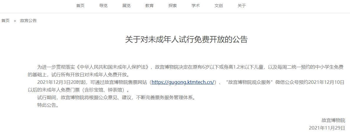 2021年12月3日20时起,可通过故宫博物院售票网站(https://gugong.ktmtech.cn/)、“故宫博物院观众服务”微信公众号预约2021年12月10日以后的未成年人免费门票(含珍宝馆、钟表馆)。