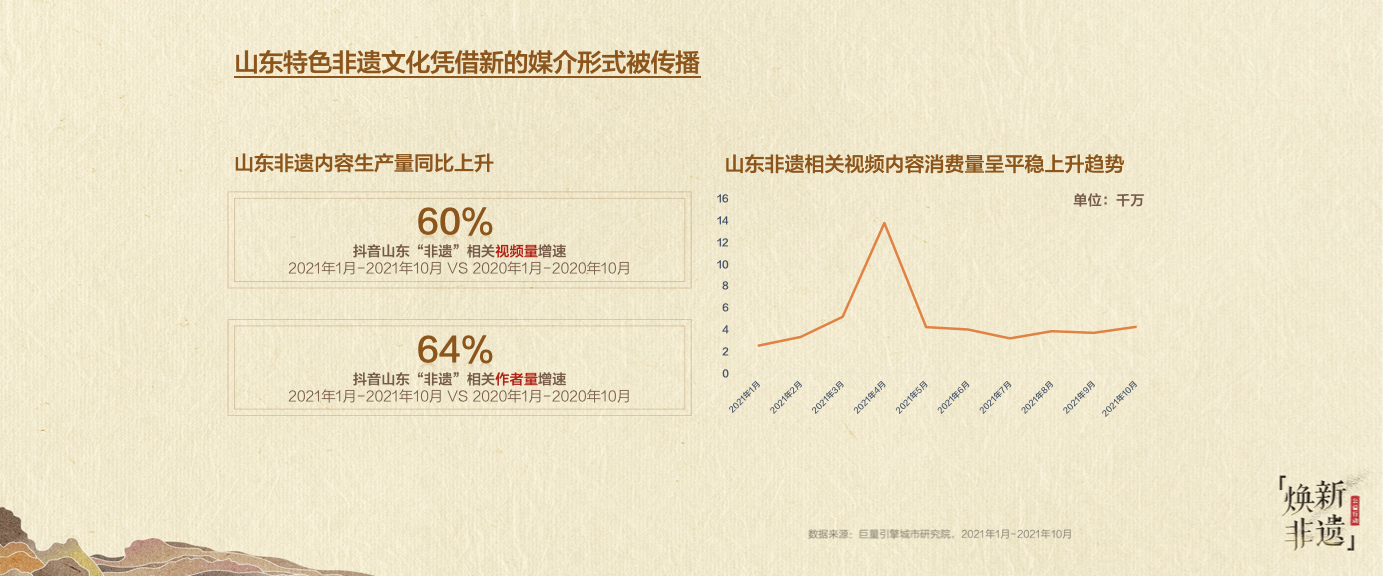 活动现场还发布了一份非遗报告《世异时移 古韵遗风-2021巨量引擎非遗文化白皮书之“山东篇”》,报告显示,2021年1月至10月,抖音山东“非遗”相关视频量的同比增速达到60%,作者量的增速达到64%,与非遗相关的视频内容消费量也呈平稳上升趋势。巨量引擎山东本地消费业务中心政务总监张晓飞表示,山东各地的非遗项目承载着不同的地方文化,也传递着不同的城市气质与品格。当非遗遇上抖音,优秀的传统文化不仅拥有了更为广阔的展示和传播平台,也同时打通了商业化赋能非遗的渠道,将非遗的文化特质延伸到新经济、新消费领域,让非遗获得了另一重全新的生命力。“通过更多ip+的打造进行品牌孵化,利用媒介做好用户沟通和交易,吸引更多人才涌入实现高质量的发展,这是‘非遗’产业发展即将迎来的新未来。”