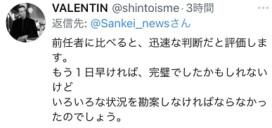 “跟前任相比,做判断很迅速,值得赞赏。如果再早一天就完美了,不过很多事必须综合考量。(无可厚非)”