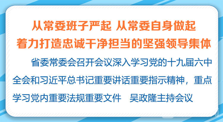 荔枝新闻讯 11月29日,省委常委会召开会议,坚持以习近平新时代中国特色社会主义思想为指导,深入学习党的十九届六中全会和习近平总书记重要讲话重要指示精神,重点学习《中国共产党章程》、《关于新形势下党内政治生活的若干准则》、中央八项规定及其实施细则精神和《中共中央关于党的百年奋斗重大成就和历史经验的决议》、《中共中央关于加强对“一把手”和领导班子监督的意见》、《中共中央办公厅关于解决形式主义突出问题为基层减负的通知》等党内重要法规重要文件。省委书记吴政隆主持会议。