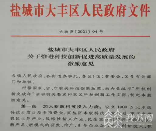 大丰区出台《关于推进科技创新促进高质量发展的激励意见》,制定企业研发投入专项政策、院企技术合作专项政策和人才政策,将区本级科技计划项目资金规模由250万元提升至1000万元,研发费用达标奖励比例由1%提升至3%,研发奖励上限由50万元提高到80万元,政策含金量盐城最优。