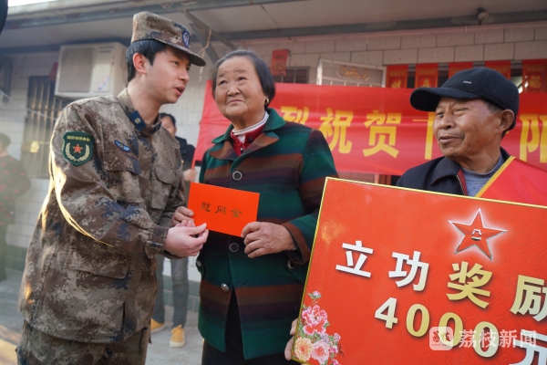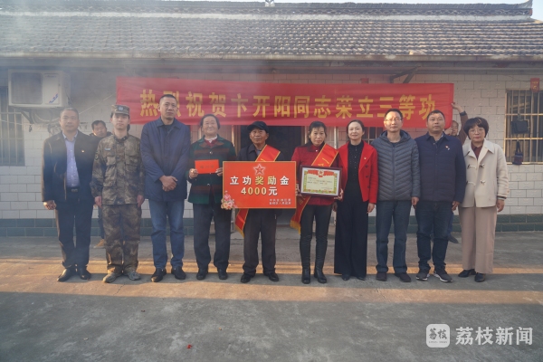 一人立功,全家光荣。11月23日下午,盐都区大冈镇抬头村锣鼓喧天、热闹非凡。区退役军人事务局、区人武部等部门为荣立三等功的现役军人卞开阳家属,送去立功喜报和慰问金。