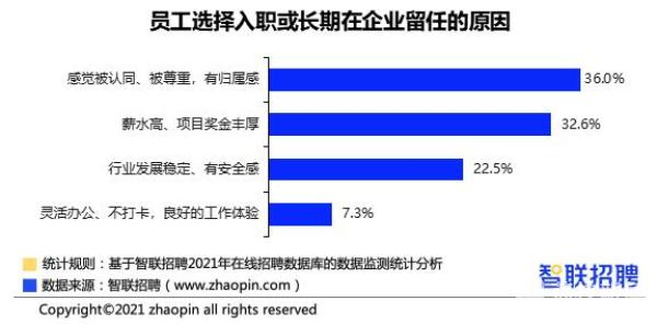 在被问到“哪一项最有可能成为你选择该企业或者长期留在该企业的原因?”时,36.0%的职场人选择“被认同、被尊重、有归属感”,占比排在第一位。高于“薪水高、项目奖金丰厚”的32.6%,22.5%的职场人基于行业发展稳定等大环境优越而留任。可见,企业留住人才的关键是给予充分尊重,让其有归属感,其次才是“钱给足”。