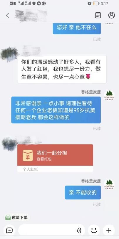 江苏80后淘宝店主杨伟给95岁志愿军老兵送两张床的事,这几天引起大量网友的关注与点赞,记者在采访中得知,“两张床免费送”的爱心还在延续,一些热心网友给店里的客服转来红包说“你只管送,我们一起分担”。