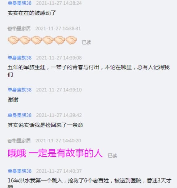 这是一位参加过抗洪抢险的退役军人,看了最近的报道后,主动在线上和杨伟聊起了过往经历。2016年的时候,这位5年老兵在洪水救灾中第一个跳入水中救出了六个人,老兵后来在医院昏迷三天才醒来。但老兵一直表示,他做的这些其实挺微不足道的,”但是不管在哪里,总有人记住我们,实实在在被感动了“。杨伟说,”我听了很触动,跟他聊的时候哭了三四次。”