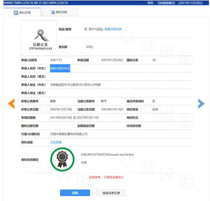 澎湃新闻查询国家知识产权局商标局信息发现,“信阳毛尖”商标由信阳市茶叶协会在2001年申请,商标类型为证明,专用权期限为2013年3月14日至 2023年3月13日。