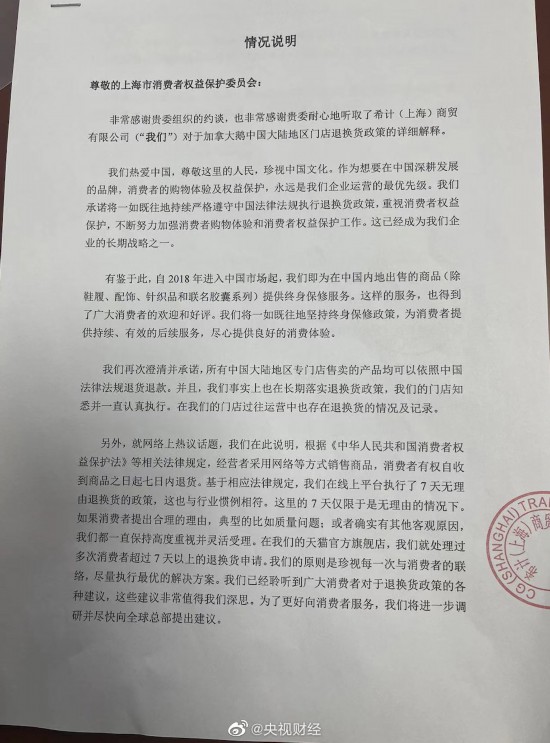 12月1日上午,上海市消保委就消费者所关心的加拿大鹅专门店的《更换条款》的公平性合理性问题,专门约谈了加拿大鹅公司。12月1日下午,上海市消保委副秘书长唐健盛接受央视财经记者专访,认为从约谈情况来看,加拿大鹅公司对于《更换条款》的具体的含义,包括跟实际操作的相匹配度并不是非常明确,因此上海市消保委要求加拿大鹅公司就相关条款及问题,在明天中午以前要给到上海市消保委,给消费者一个明确说明。据记者了解,12月2日下午2点,加拿大鹅公司派一人到上海消保委递交了材料。