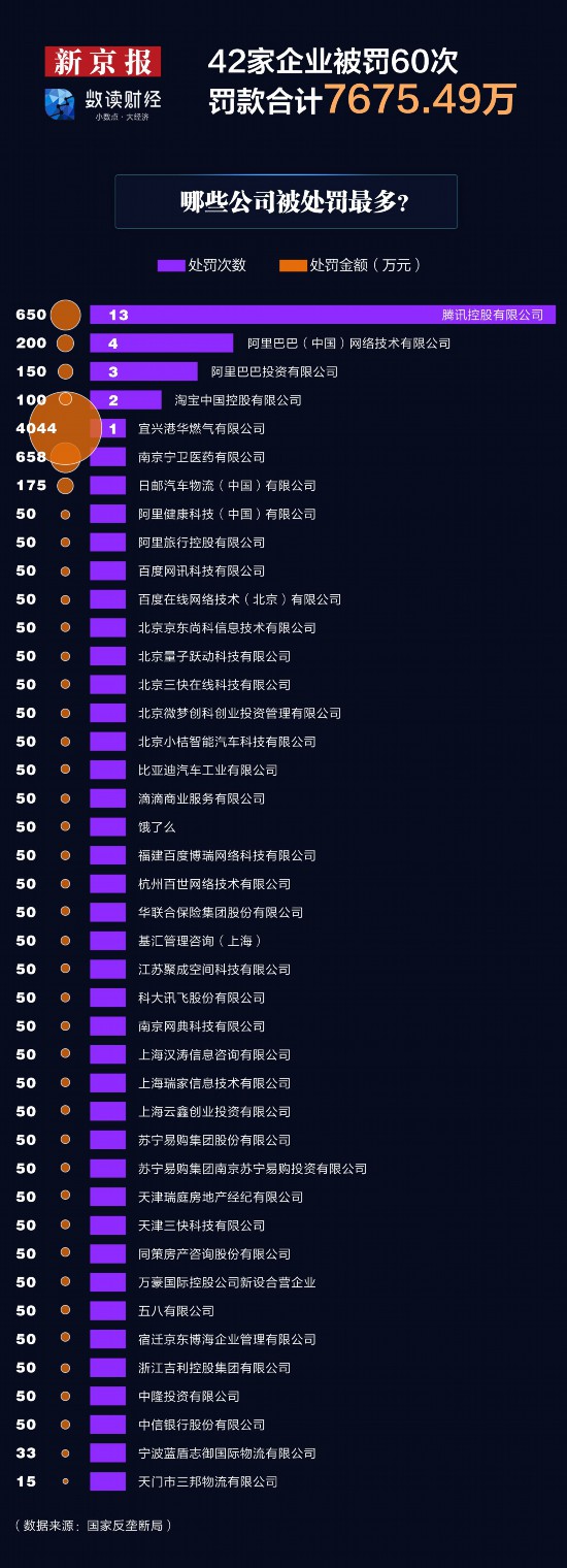新京报贝壳财经记者梳理数据发现,在国家反垄断局成立后发布的46条行政处罚决定书中,腾讯控股累计被罚650万元,阿里系企业累计被罚600万元。
