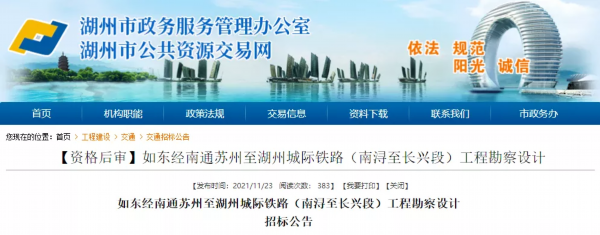 近日,如东经南通苏州至湖州城际铁路(南浔至长兴段)工程勘察设计招标公告发布。