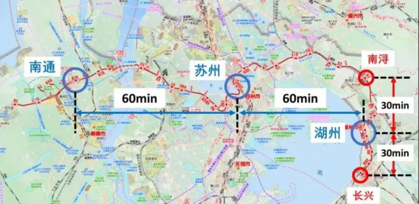 如通苏湖城际铁路连通了南通、苏州和湖州三地,串联沿海发展带、沿江发展带和沪宁发展带,纵贯苏锡常都市圈东部、杭州都市圈北部,是长三角核心区城市之间重要的快速城际。