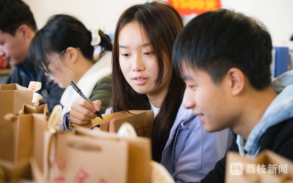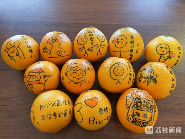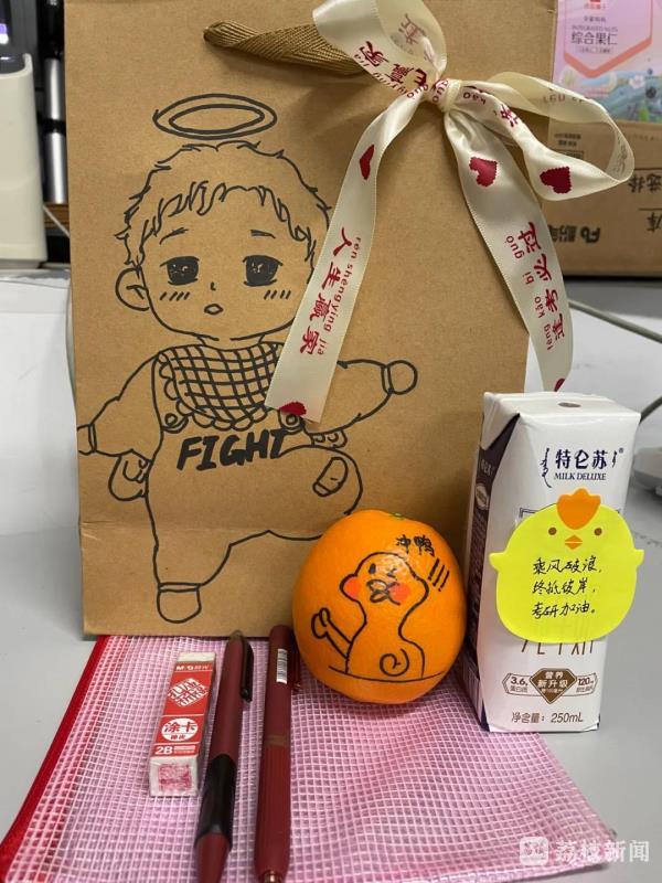 每一份“暖心加油包”里,有寓意“心想事成”的橙子,寓意“牛气冲天”的牛奶,还有一套寓意“金榜题名”的文具套装。无论是礼包上的手绘图,还是橙子上的表情包,抑或是牛奶盒上的正能量语录,每一处手工点缀,都让考研学子们感受到来自老师和同学暖意融融的真挚鼓励。