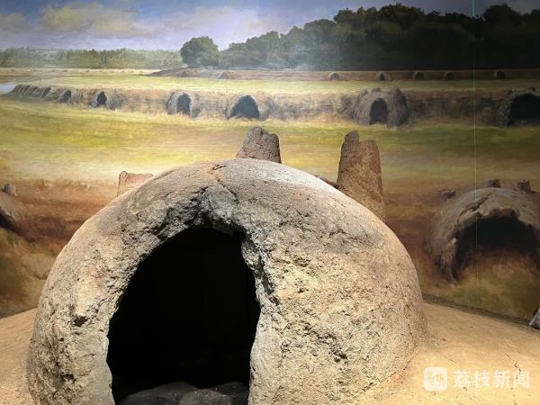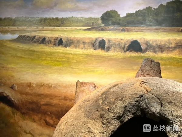 此刻,砖窑静静地伫立在展厅中。在它的背后,是一幅巨型精致手绘墙面,再现了当年专家们初见江西黎川砖窑遗址的宏大场面——沿临河分布有许多砖窑,这些砖窑保存较为完好,大小类似,形制都呈典型的馒头状,上面还带有三孔烟囱,绵延错落,蔚为壮观!