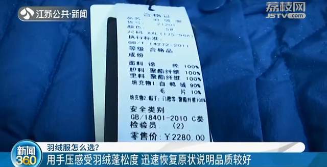 记者注意到,这件蓬松度比较好的羽绒服,吊牌显示填充物白鸭绒为90%,而这件蓬松度相对较差的羽绒服,吊牌并没有标注具体含绒量:“首先这个标识不太规范,没有标注一个含绒量,还有它的一个充绒量,实际检测出来它的品质也不是太好的,比如含绒量只有51%。”
