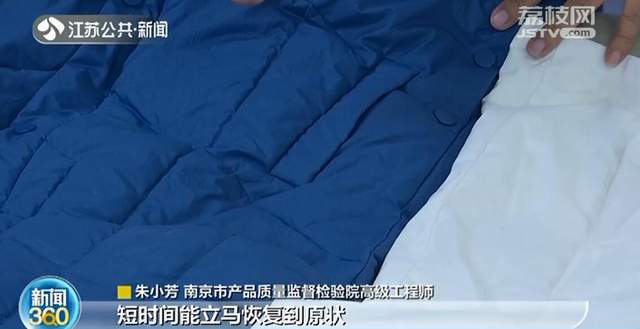 所谓充绒量就是一件衣服填充的羽绒越多、越厚自然也更保暖一些,而蓬松度我们可以依靠手感来进行判断:“可以看一下这两件样品一个比对,我们用手摁压一下,可以看到它没有一个明显的回弹过程,同样看一下这个,我们用手摁一下,可以看到短时间可以立马恢复到原状,说明它的蓬松度是好的。”