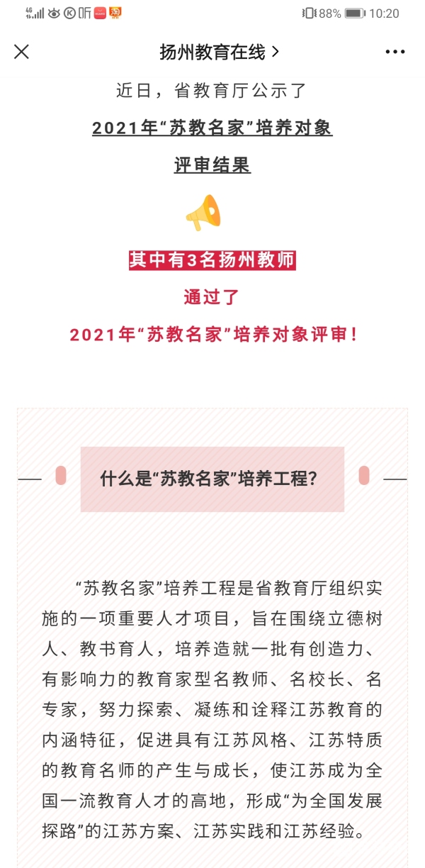 今天(12月5日)记者从扬州市教育局了解到,扬州有3名教师通过了2021年“苏教名家”培养对象评审。他们分别是:扬州育才实验学校副校长杨宏权、扬州市育才小学西区校校长、党总支书记李吉银、南京师范大学第二附属高级中学副书记花奎。