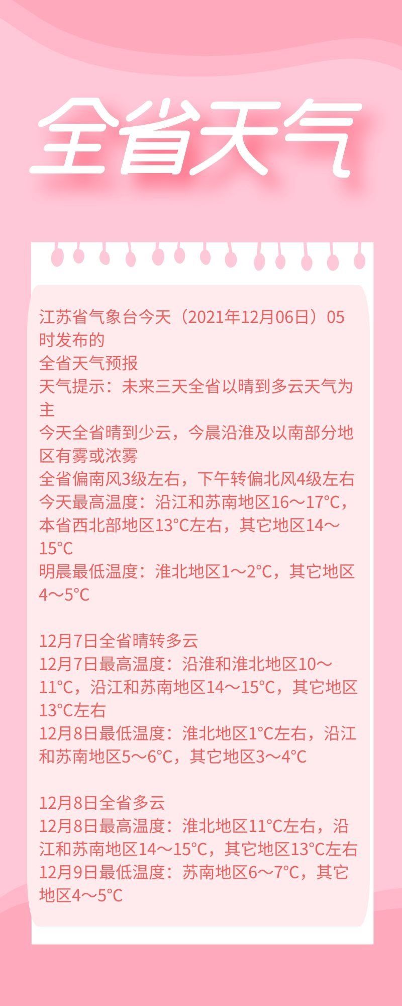 未来三天全省以晴到多云天气为主。今天全省晴到少云,今晨沿淮及以南部分地区有雾或浓雾,全省偏南风3级左右,下午转偏北风4级左右,今天最高温度:沿江和苏南地区16~17℃,本省西北部地区13℃左右,其它地区14~15℃,明晨最低温度:淮北地区1~2℃,其它地区4~5℃。 早晚温差依旧比较大,早起上班的小伙伴们还是要注意保暖。