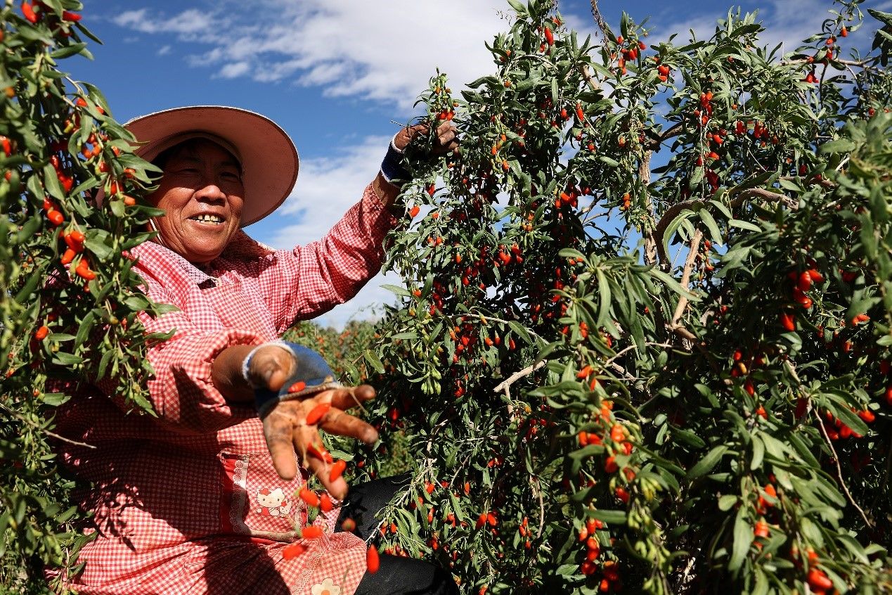 ▲ 宁夏枸杞一年能收6-8茬,每年6-7月是丰收季。百瑞源在宁夏的3个种植基地能在丰收季为当地提供1000多个工作岗位。安舜|摄