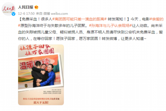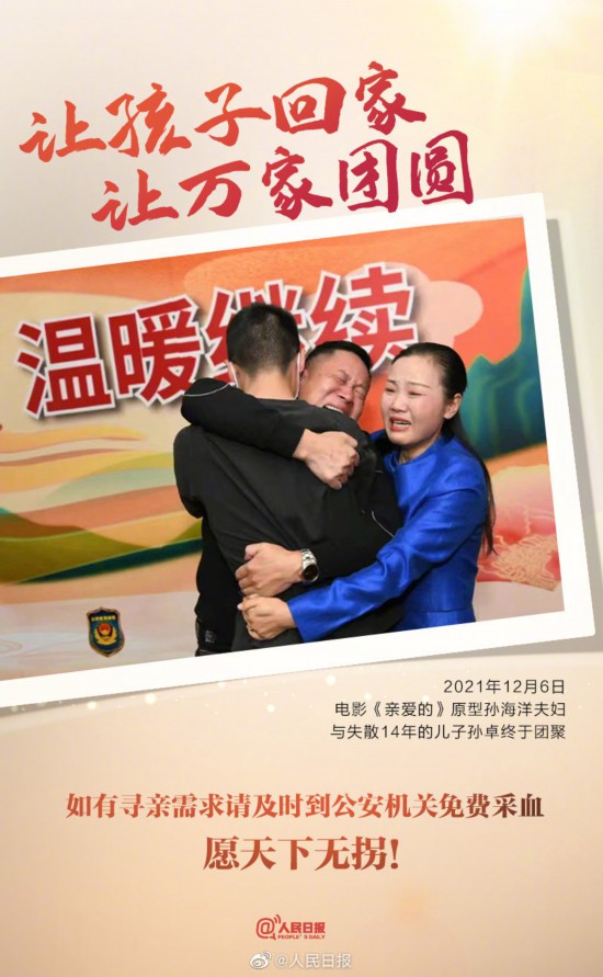 今天,电影《亲爱的》原型孙海洋终于与失散多年的儿子团聚。孙海洋与儿子认亲现场让人动容。尚未采血的失踪被拐儿童父母、疑似被拐人员、身源不明人员请尽快到公安机关免费采血,爱你的人,在等你回家!愿孩子回家,愿万家团圆!转发微博,让更多人知道~