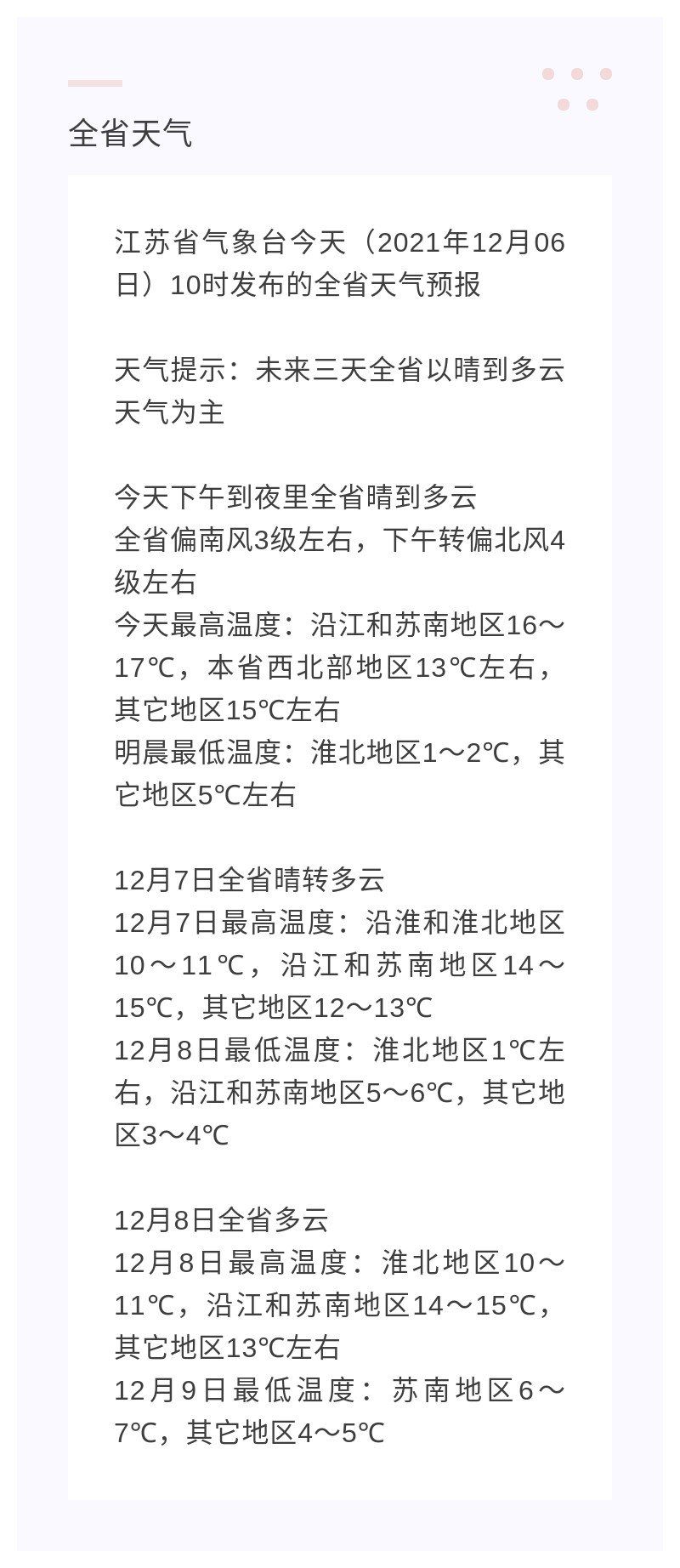 而据江苏省气象台,未来三天全省以晴到多云天气为主。今天(6日)下午到夜里全省晴到多云,全省偏南风3级左右,下午转偏北风4级左右,今天最高温度:沿江和苏南地区16~17℃,本省西北部地区13℃左右,其它地区15℃左右,明晨最低温度:淮北地区1~2℃,其它地区5℃左右。