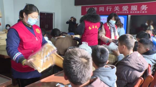 清江浦区“爱的奉献”公益社志愿者来到黄码乡中心小学,为这里的贫困留守儿童送来了暖冬物资。