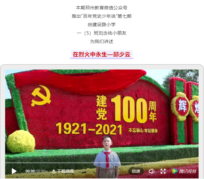 开展“邳小红”进校园红色故事代代传活动。引导少先队员、共青团员以线上线下相结合的形式,结合自身实际学党史、说感受、谈打算,讲好身边人的先进事迹和英雄故事。举办“党史少年说”微视频评选展播,通过邳州教育微信公众号、校园网、家长群等途径推广展示、评选表彰,激励青少年儿童传承红色基因,争做新时代好少年,点击量已达4万多人次。