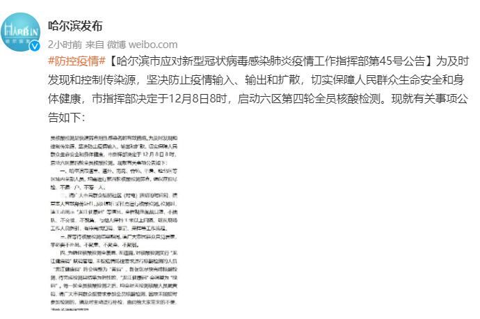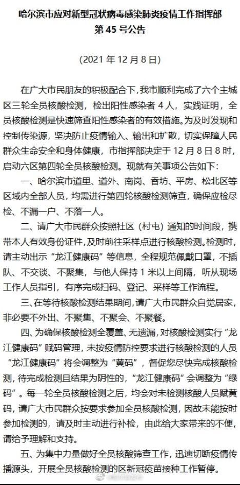 荔枝新闻讯 据“哈尔滨发布”微博消息,8日,哈尔滨市应对新冠肺炎疫情工作指挥部发布第45号公告,全市目前完成了六个主城区三轮全员核酸检测,检出阳性感染者4人。为及时发现和控制传染源,市指挥部决定于12月8日8时,启动六区第四轮全员核酸检测。