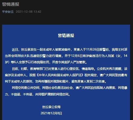 荔枝新闻讯 据“平安封丘”微信号消息,近日,封丘县发生一起未成年人被欺凌案件,受害人于11月26日报警后,封丘县公安局王村派出所会同刑侦大队迅速组织警力进行调查,并于12月6日将涉案违法行为人刘某(女,14岁)等6人全部予以行政拘留处罚,并责令其监护人严加管教。