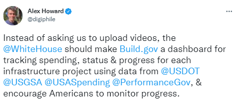 对此,有网友说:“与其让我们上传视频,白宫应该让‘Build.gov’成为使用数据跟踪(美国)每个基础设施项目支出、状态和进展的仪表盘,鼓励美国民众去监督进展。”↓