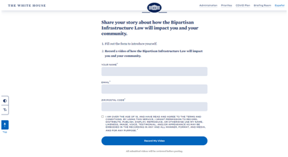 不过,该网站似乎和网友想象的有点区别。点开网站,映入眼帘的就是新口号“建设更美好美国”的设计图像,往下则是一个上传界面,号召美国民众以视频录像方式记录拜登政府这一基建法案是如何影响了每个人的生活。