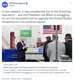 拜登如此下力宣传,也引起其他一些外媒注意。法新社报道称,拜登是“试图让美国人对这一基建法案都感到兴奋”。不过该媒体点出,不论是推出的新网站、还是拜登最新的堪萨斯城之旅,均表明一点:“拜登正努力将美国这一基建法案升级为(自己的)政治资本。”