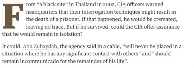 为了配合所谓的反恐战争,CIA在全球一些国家设立了“黑监狱”,而这封电报正是从其在泰国设立的“黑监狱”发出的。电报中,被CIA下达了这道“蒸发密令”的囚犯叫阿布·祖拜达。