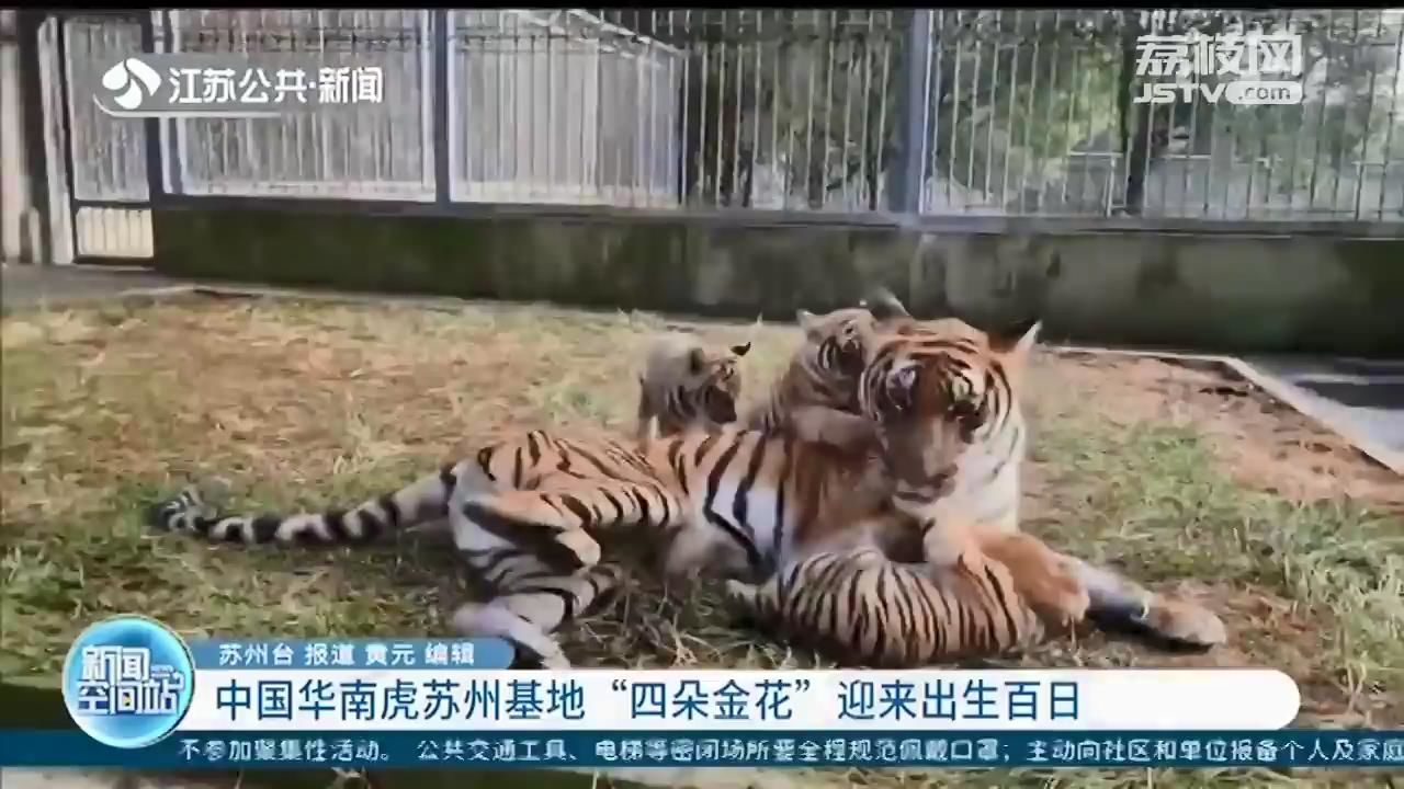 苏州台记者胡晗雨说:“在我身后的就是英雄虎妈妈皮皮,她今年才三岁半,这也是她第一次分娩。她身后就是四只小母老虎,刚刚满100天的四姐妹‘平分秋色’。饲养员说皮皮的母性非常好,四只小老虎自9月1号出生以来,都是皮皮在自己喂奶,保护着她的四个小崽崽。”