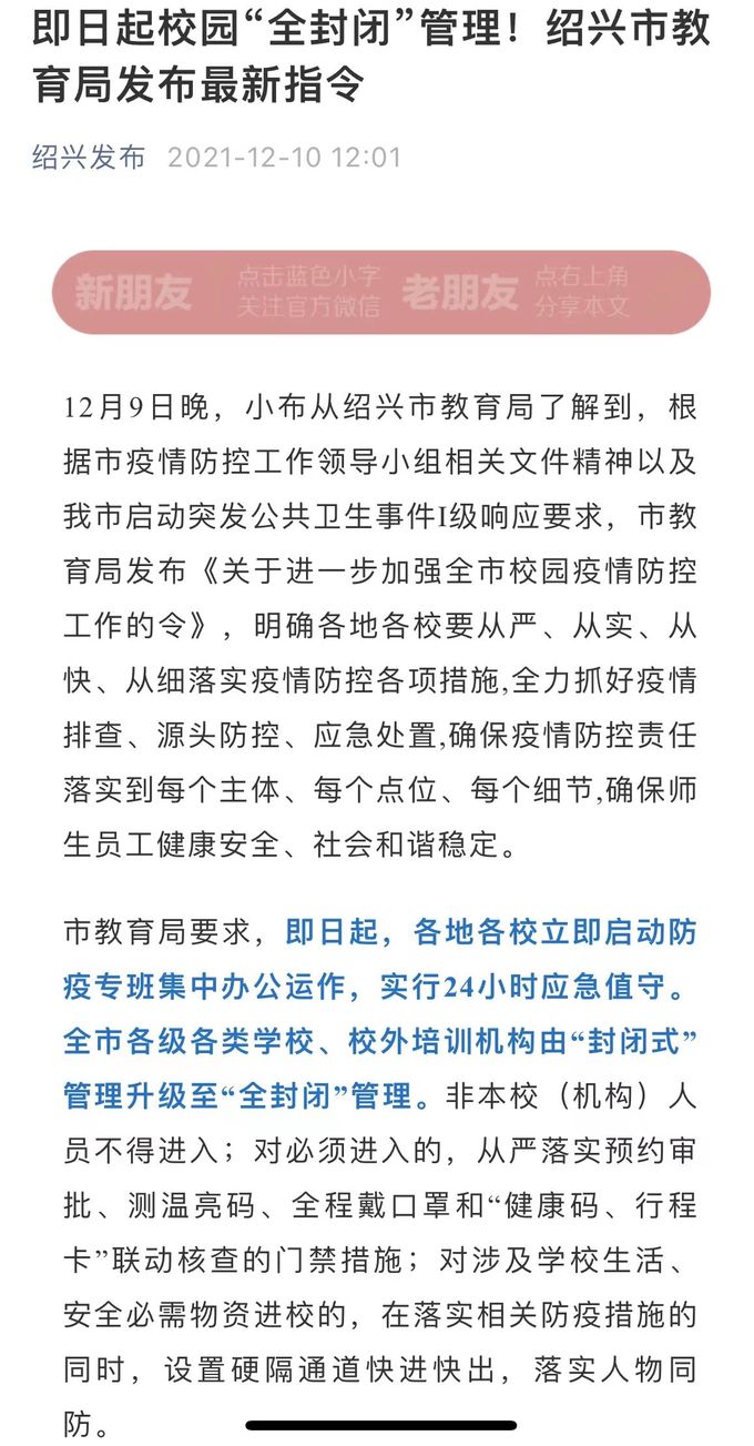 12月9日晚,小编从绍兴市教育局了解到,根据市疫情防控工作领导小组相关文件精神以及绍兴市启动突发公共卫生事件I级响应要求,市教育局发布《关于进一步加强全市校园疫情防控工作的令》,明确各地各校要从严、从实、从快、从细落实疫情防控各项措施,全力抓好疫情排查、源头防控、应急处置,确保疫情防控责任落实到每个主体、每个点位、每个细节,确保师生员工健康安全、社会和谐稳定。