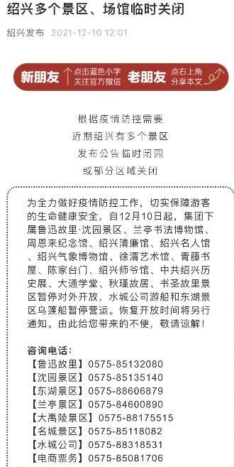 为全力做好疫情防控工作,切实保障游客的生命健康安全,自12月10日起,鲁迅故里·沈园景区、兰亭书法博物馆、周恩来纪念馆、绍兴清廉馆、绍兴名人馆、绍兴气象博物馆、徐渭艺术馆、青藤书屋、陈家台门、绍兴师爷馆、中共绍兴历史展、大通学堂、秋瑾故居、书圣故里景区暂停对外开放,水城公司游船和东湖景区乌篷船暂停营运。恢复开放时间将另行通知。 由此给您带来的不便,敬请谅解!