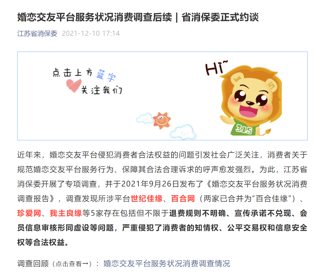 为了维护广大消费者合法权益,保障适婚人群的婚恋交友安全,江苏省消保委于2021年12月10日上午进行了线上“云约谈”,百合佳缘、我主良缘、珍爱网均派相关业务人员积极参加,并于约谈会上就报告中发现问题详述整改情况及下一步整改措施。