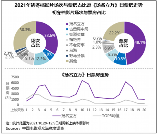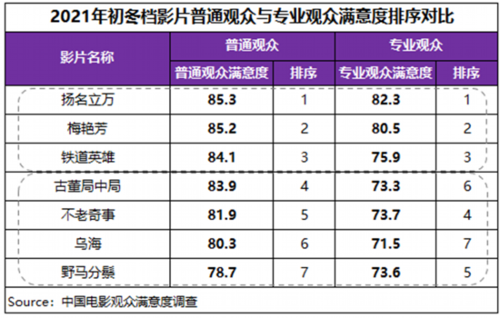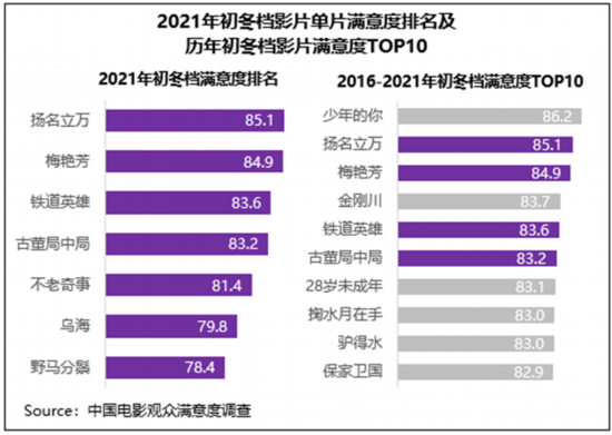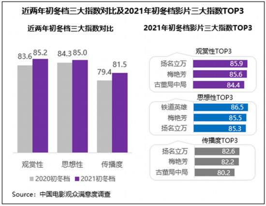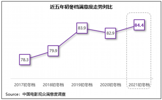 中国电影观众满意度调查·2021年初冬档调查结果显示,初冬档满意度84.4分,居近五年同期第一位,同比增长1.5分,同时较疫情前的2019年同期也增长了0.5分。其中悬疑喜剧片《扬名立万》满意度与票房双双“折桂”,音乐传记片《梅艳芳》、历史动作片《铁道英雄》、悬疑剧情片《古董局中局》满意度也悉数超83分。档期内类型和题材丰富多元的内容组合较好的满足了日趋多元细分的观影口味,得到了观众的高满意度评价。