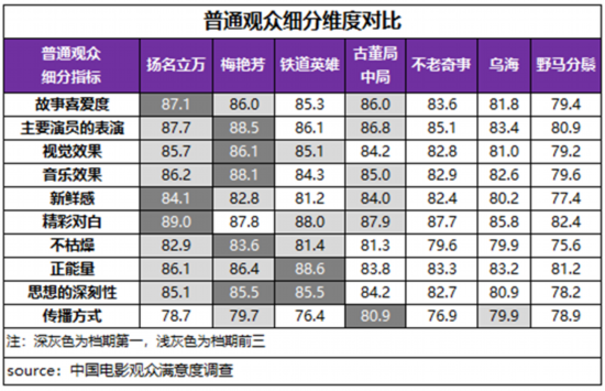 在普通观众评价中,《梅艳芳》在主要演员的表演、视觉效果、音乐效果、不枯燥和思想深刻性这5项指标得分上居第一位,《扬名立万》的故事喜爱度、新鲜感和精彩对白得分居第一位,《铁道英雄》的正能量、思想深刻性以及《古董局中局》的传播方式得分居第一位。另外,《乌海》的传播方式评分也居档期前三位。