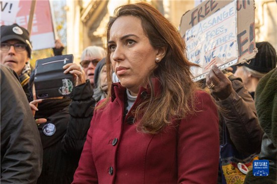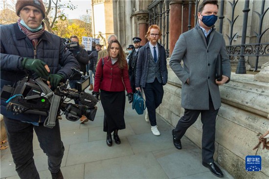 12月10日,阿桑奇的伴侣丝特拉·莫里斯(中)在位于伦敦的英国高等法院外行走。新华社发(雷伊·唐 摄)