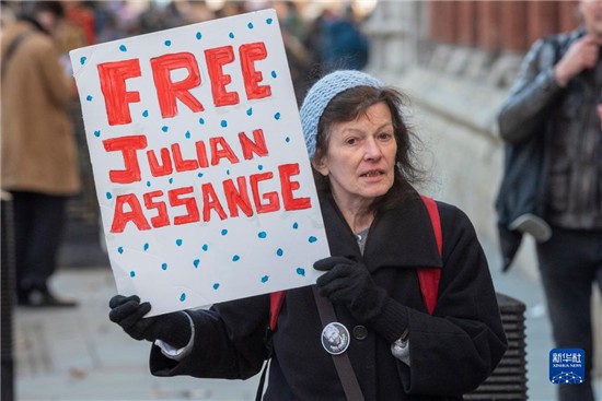 这是12月10日在位于伦敦的英国高等法院外拍摄的阿桑奇的支持者。新华社发(雷伊·唐 摄)