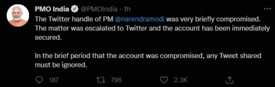 北京时间12日6时左右,印总理办公室推特账号(@PMOIndia)发文,通知了这一消息:“总理莫迪的个人推特账号(@narendramodi)暂时被盗。此事已提交至推特官方,该账户已被立即保护。在账号被盗的短暂期间,其分享的任何推文内容必须被忽略。”↓