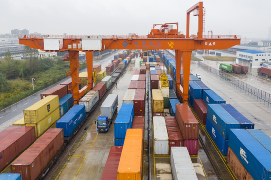 一批货物正在装车,准备从中欧班列金东平台发往哈萨克斯坦