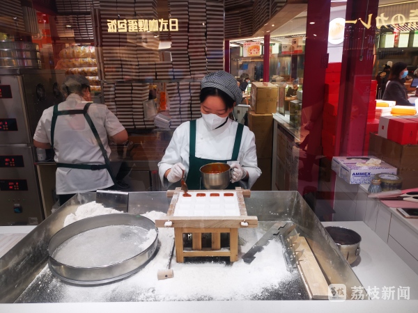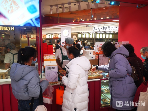 在南京新百负一楼大兴糕团南京首店前,不少市民正排队购买。对即将到来的元旦、春节,门店已经做好了充足的准备,相关礼盒产品已经推出。