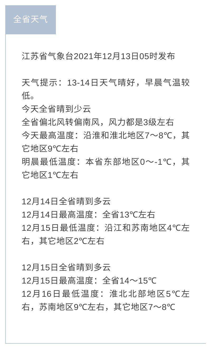 据江苏省气象台,今天(13日)全省晴到少云,全省偏北风转偏南风,风力都是3级左右,今天最高温度:沿淮和淮北地区7~8℃,其它地区9℃左右,明晨最低温度:本省东部地区0~-1℃,其它地区1℃左右。