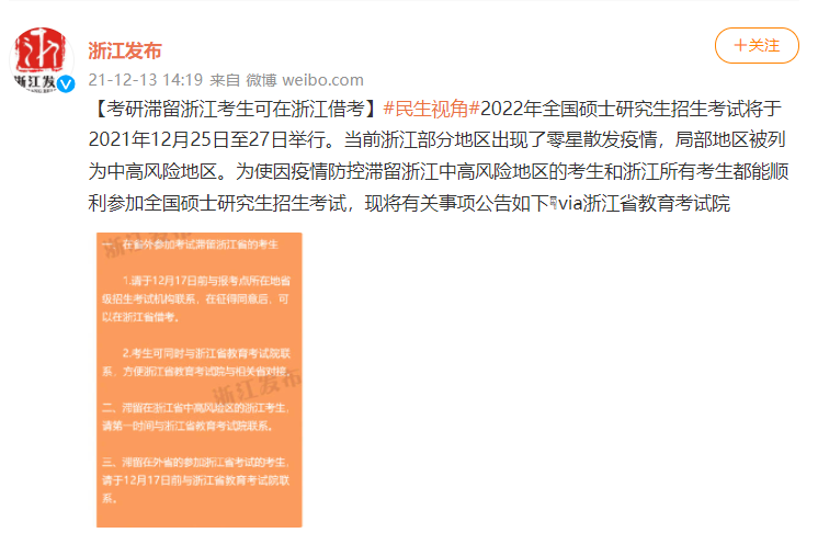 荔枝新闻讯 “浙江发布”微博12月13日消息,2022年全国硕士研究生招生考试将于2021年12月25日至27日举行。当前浙江部分地区出现了零星散发疫情,局部地区被列为中高风险地区。为使因疫情防控滞留浙江中高风险地区的考生和浙江所有考生都能顺利参加全国硕士研究生招生考试,现将有关事项公告如下: