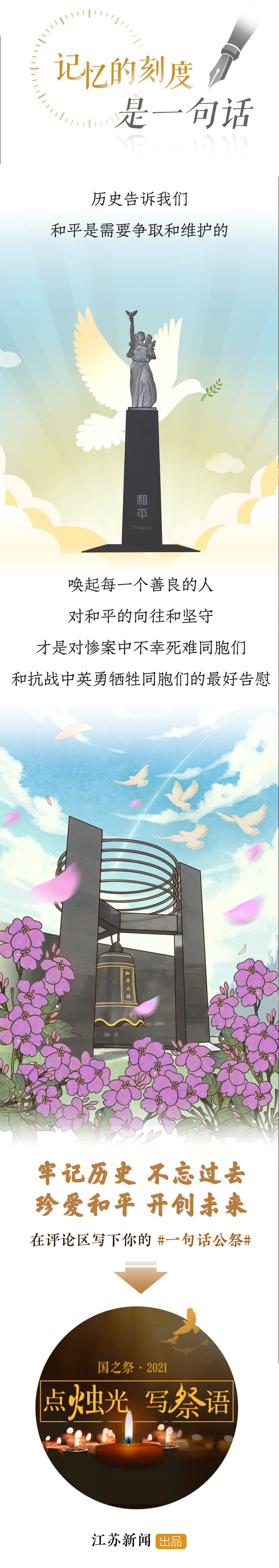 南京大屠杀,是人类历史上十分黑暗的一页。记忆的刻度是幸存者墙中渐次熄灭的灯,是纪念馆每12秒落下的水滴,是84年前国际友人记下的珍贵史料,也是我们守望和平、告慰同胞的和平寄语!写下你的“一句话公祭”,铭记历史,珍爱和平!