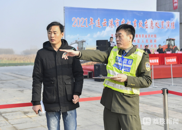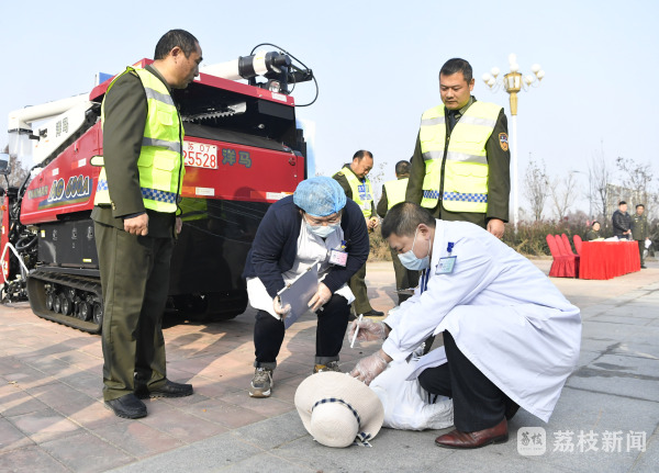 “120吗?这里有个人被收割机撞伤了,在浦南镇浦南村204国道东边地里,你们快来,快派救护车来!”12月10日,在连云港市海州区2021全市农机事故应急处置演练现场,打完120急救电话后,收割机驾驶员赵海按计划向农机安全监理机关报案。