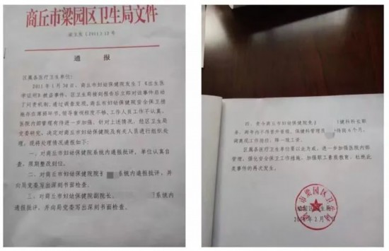 记者了解到,商丘市梁园区卫生局(现为商丘市梁园区卫健委)曾于2011年2月7日发布一份红头文件,称该局接到被盗事件报告后立即启动了问责机制,通过调查发现:商丘市妇幼保健院安全保卫措施存在薄弱环节,领导重视程度不够,工作人员工作不认真,医院内部管理有待进一步加强。处理情况包括对该院院长、副院长等人进行通报批评,要求写出深刻书面检查,免去该院保健科科长职务,保健科管理员调离岗位等。