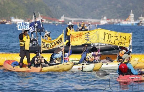 日本政府为美军普天间机场搬迁工程,在冲绳县名护市边野古沿岸投放沙土到14日满三年。据日本共同社消息,反对机场迁入的民众当天乘坐皮艇,在填埋海域附近的海上抗议,要求叫停工程。