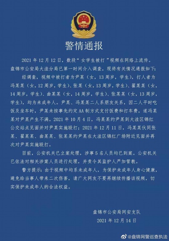 12月14日,盘锦市公安局网安支队通报,2021年12月12日,数段“女学生被打”视频在网络上流传。盘锦市公安局大洼分局已第一时间介入调查。